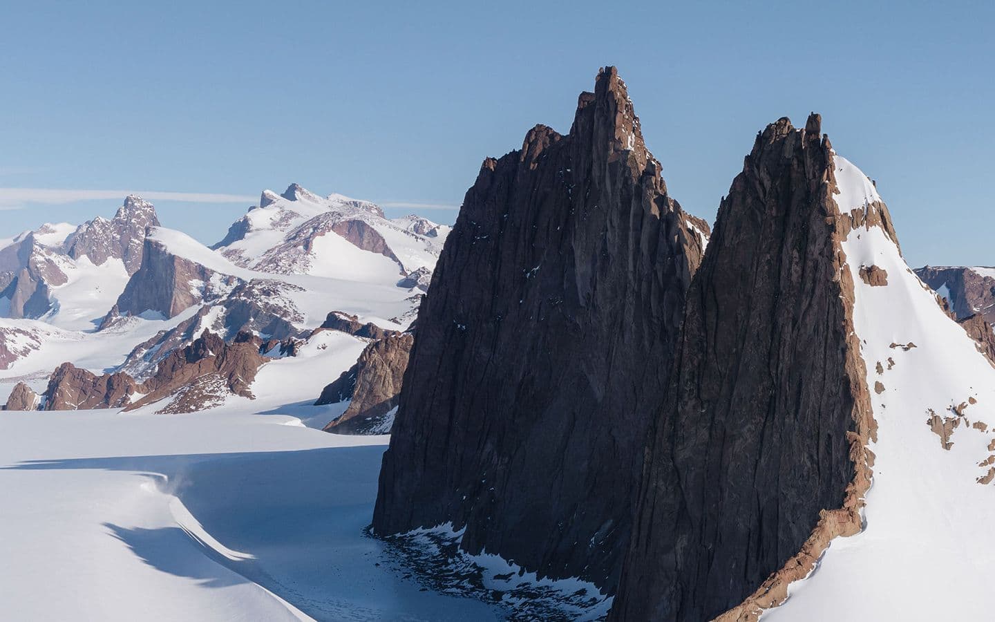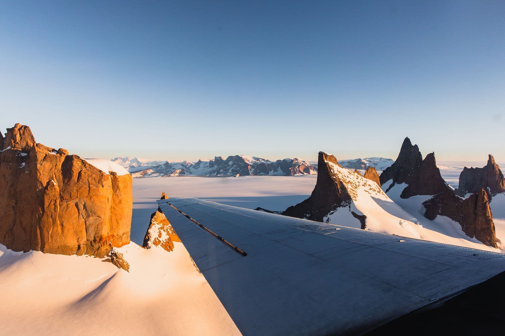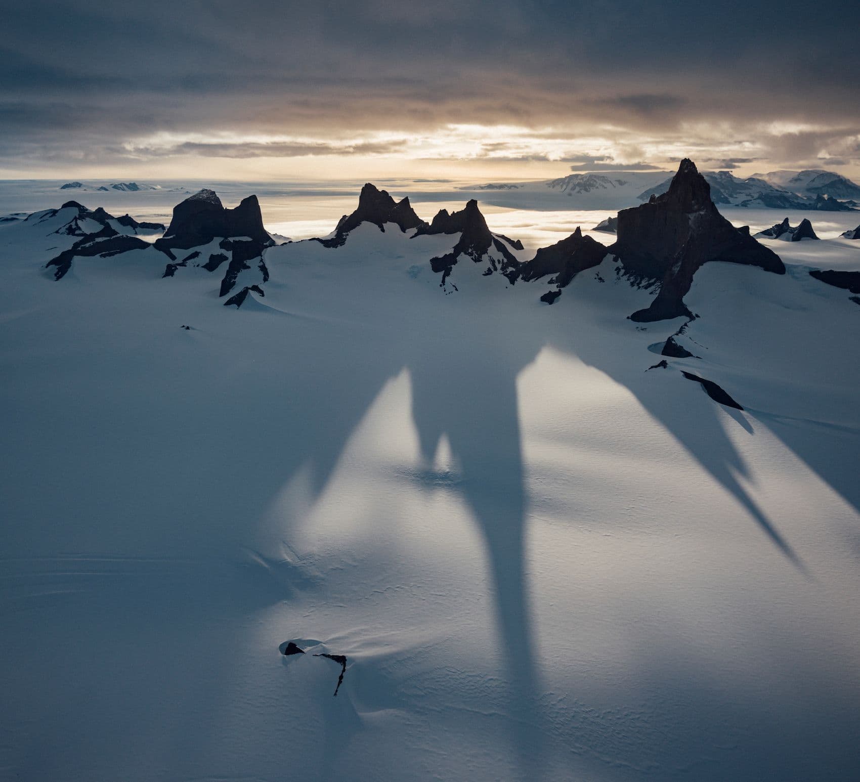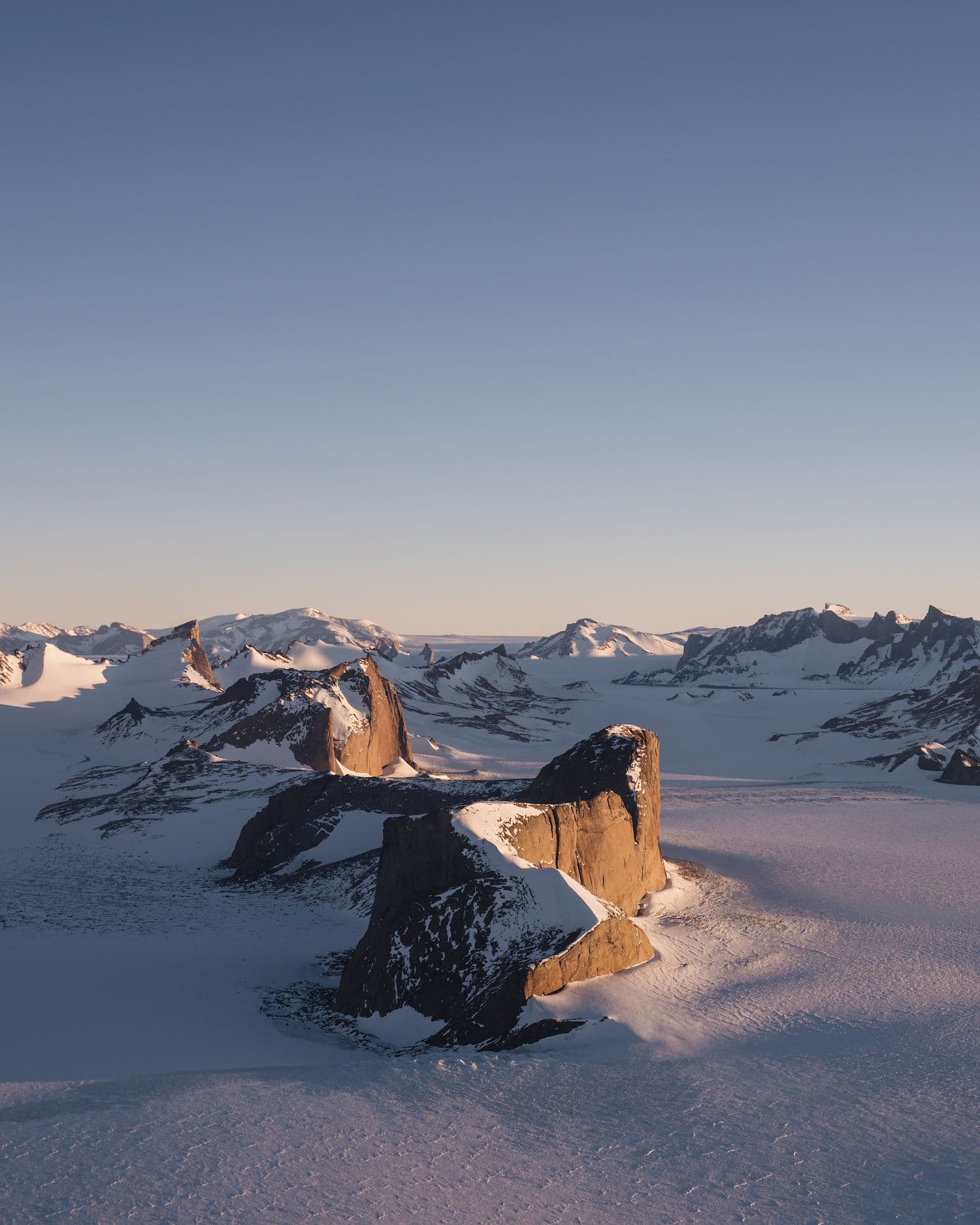 Rising starkly from the East Antarctic Ice Sheet, the Drygalski Mountains of Queen Maud Land are among the most remote and visually arresting ranges on the continent. These mountains consist of towering nunataks and sharp granite spires that protrude through thousands of metres of ice, offering a rare glimpse into the ancient bedrock of East Antarctica. Many of these peaks are part of the Precambrian East Antarctic Shield and contain rocks more than a billion years old, shaped by deep-time metamorphism and tectonic collisions long before Antarctica drifted into its polar position. The dramatic T-Rex Nunatak, with its sculpted granite profiles and wind-carved flanks, stands like a sentinel above sweeping glaciers and vast crevasse fields formed by the constant flow and deformation of the ice sheet. Within this wild expanse lie Wolf’s Fang Runway and Echo Base Camp, two remarkable footholds that allow access to some of the continent’s most awe-inspiring terrain without disturbing the vast silence that defines it.